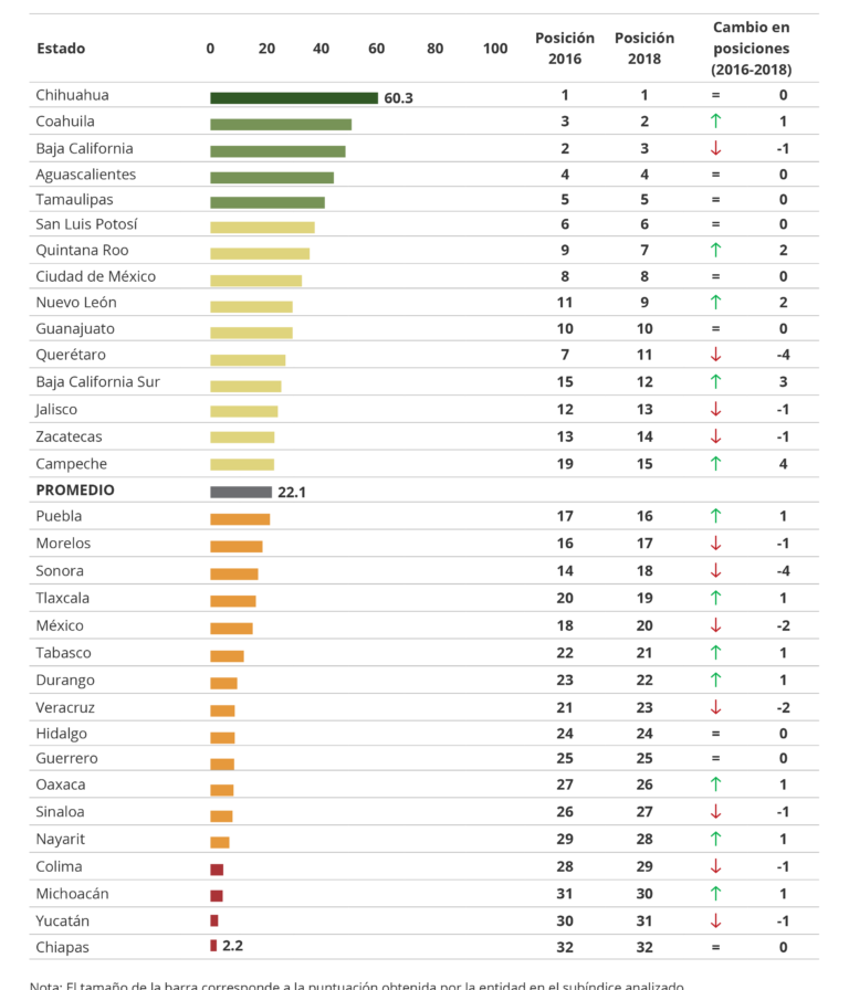 Además avanzó posiciones en otros subíndices analizados, como el de Sociedad incluyente, preparada y sana, donde pasó del lugar 14 que tenía en 2016, al 13 en 2018 y se mantuvo en las mismas posiciones en los índices de Innovación y sofisticación en los sectores económicos, y Sectores productores de clase mundial.