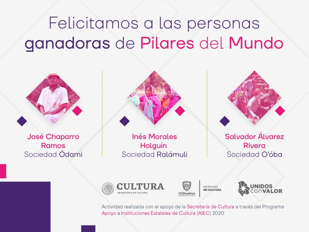 La Secretaría de Cultura de Chihuahua, en coordinación con la Secretaría de Cultura Federal, dio a conocer a las personas ganadoras del certamen Pilares del Mundo, Tesoros Humanos Vivos 2020, que fomenta la preservación y mantenimiento de las expresiones y prácticas culturales vigentes en las comunidades indígenas.