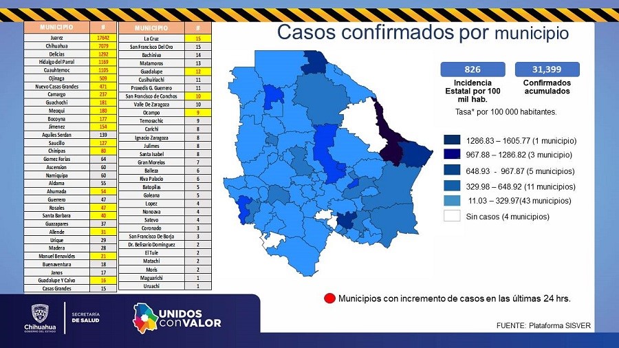 Los contagios por municipios son: Ahumada 54 casos confirmados, Aldama 55, Allende 31, Ascensión 60, Aquiles Serdán 139, Bachíniva 14, Batopilas 5, Bocoyna 177, Balleza 6, Buenaventura 18, Camargo 237, Carichí 8, Casas Grandes 15, Chihuahua 7 mil 079, Chínipas 80, Coronado 3, Cuauhtémoc 1,105, Cusihuiriachi 11, Delicias 1,292, Belisario Domínguez 2, Galeana 5, Gómez Farías 64, Guachochi 181, Gran Morelos 7, Guadalupe 12, Guadalupe y Calvo 16, Guazapares 37, Guerrero 47.