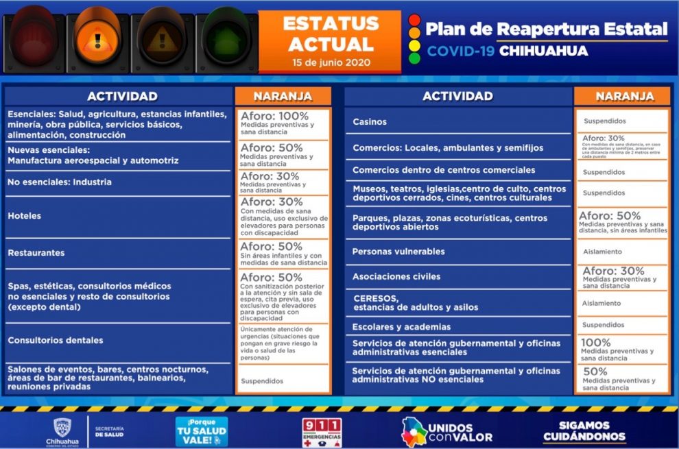 Con motivo del anuncio del gobernador del Estado, Javier Corral Jurado, respecto al cambio a color naranja en el Sistema de Semaforización, la Dirección General de Gobierno informa que a partir del próximo lunes 15 de junio los restaurantes podrán reactivar sus