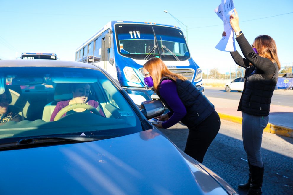 Se repartieron kits de higiene y se extendieron lonas a la vista de las y los automovilistas, así como de operadores del transporte de personal especializado, con el fin de incentivar la denuncia o solicitar apoyo al número de emergencias 9-1-1 y con la Procuraduría Estatal de la Defensa del Trabajo de la STPS.