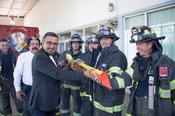 Sergio Camacho, representante del mencionado grupo dedicado al ramo de la seguridad y capacitación contra incendios, hizo entrega del donativo al director de Seguridad Pública Municipal, Gilberto Loya Chávez y al coordinador del Departamento de Bomberos, Joel Estrada Castillo, durante una ceremonia efectuada en la Estación Norte ante subdirectores y bomberos.