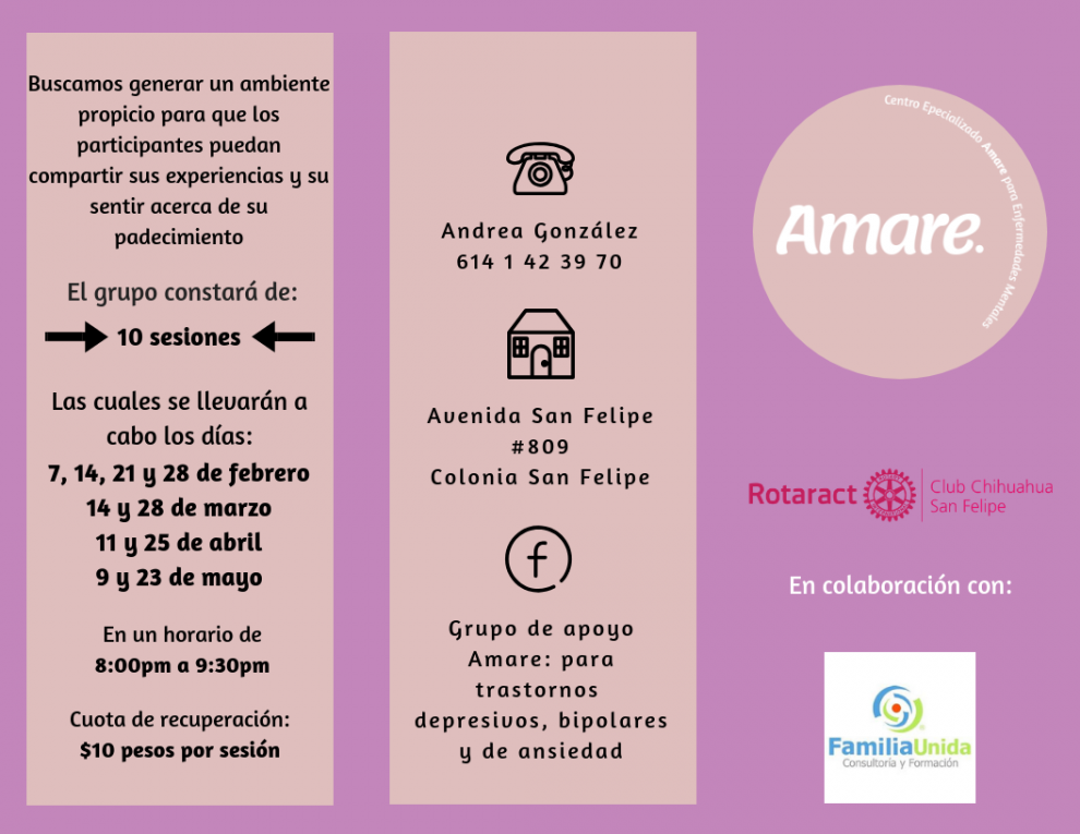 El Club Rotaract Chihuahua San Felipe, conformado por jóvenes de 22 a 29 años, con el apoyo de Familia Unida, A.C., así como varios profesionistas del sector salud, realizarán por cuarto año consecutivo la actividad denominada Grupo de Apoyo Amare: para trastornos depresivos, bipolares y de ansiedad.