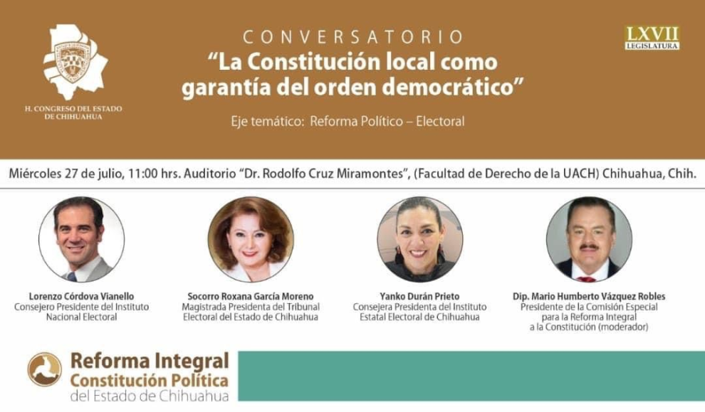 Este miércoles 27 de julio el Congreso del Estado invita al Conservatorio: “La Constitución local como Garantía del orden Democrático”, en el cual, participarán como ponentes, el Consejero Presidente del Instituto Nacional Electoral, Dr. Lorenzo Córdova Vianello, la Magistrada Presidenta del Tribunal Estatal Electoral, Mtra. Roxana García Moreno, la Consejera Presidenta del Instituto Estatal Electoral, Yanko Durán Prieto y el Diputado Mario Humberto Vázquez Robles, quién estará encargado de la