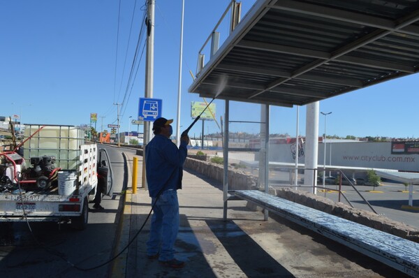 Al menos dos veces al día se lavan 250 puntos de parabuses de la ciudad en las principales avenidas y el Centro Histórico, además, se adaptaron dos unidades especiales con las cuales se desinfectan diariamente más de 650 kilómetros de vialidades, corredores industriales y corredores comerciales.