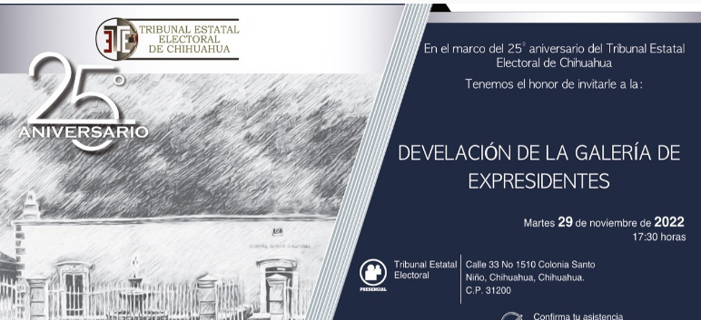 Este martes 29 de noviembre de 2022, se llevará a cabo la develación de una galería de expresidentes de este órgano jurisdiccional en el Salón del Pleno del TEE a las 17:30 horas con la presencia de los expresidentes, de sus familiares, así como del público en general.