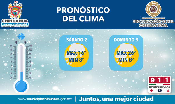 El Gobierno Municipal, a través de la Coordinación de Protección Civil Municipal emite un aviso preventivo a la ciudadanía, ya que durante este fin de semana se prevé ambiente frío y la probabilidad de precipitaciones, debido al ingreso del frente frío número 8.