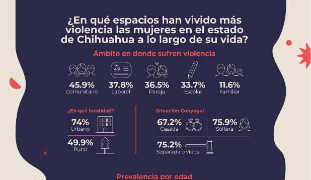 Más del 70% de las mujeres en grupos de edad de 15 años y hasta los 44 años, identifican haber vivido violencia; lo mismo comentó el 69.7% de mujeres entre 45 y 54 años de edad, así como el 57.5% de 55 años y más del estado de Chihuahua.