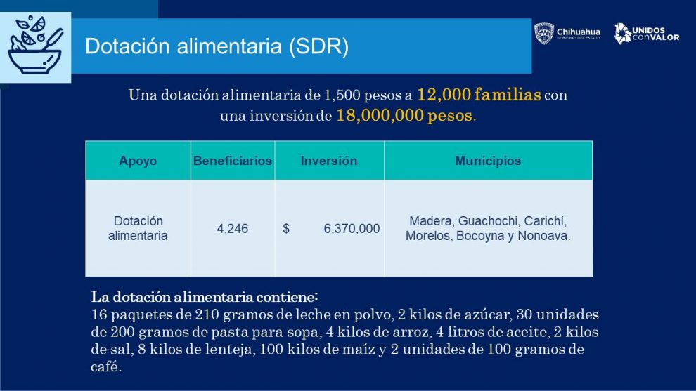 Dijo que ya fueron distribuidos 4 mil 246 dotaciones en Guachochi, Carichí, Morelos, Madera, Bocoyna y Nonoava.