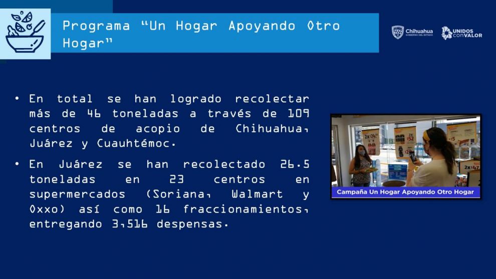 La presidenta del DIF precisó que para la región de Juárez el esfuerzo institucional permite apoyar a más de 22 mil personas, con una inversión superior a los 19 millones de pesos, a través de la entrega de despensas para personas en situación vulnerable.