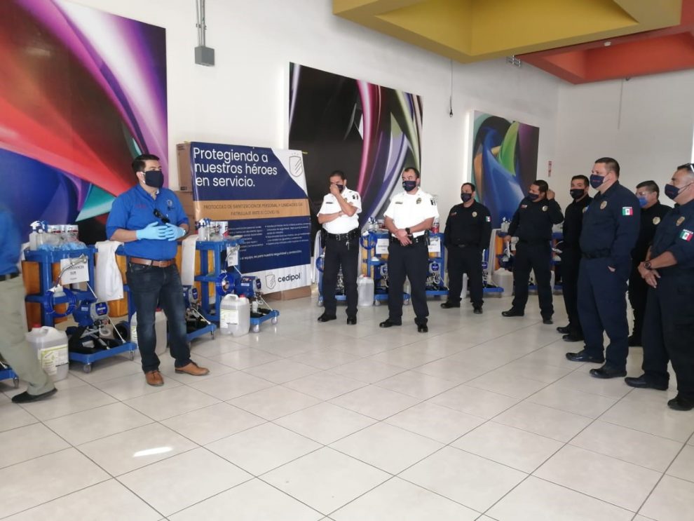 Como parte de las acciones de prevención para evitar el posible contagio de COVID-19, policías y bomberos pertenecientes a la Dirección de Seguridad Pública Municipal de Chihuahua recibieron de parte de FICOSEC con apoyo del Centro de Desarrollo Integral Policial (CEDIPOL), el material e infraestructura para instalar 10 puntos de sanitización para las unidades de patrullaje y sus operadores.