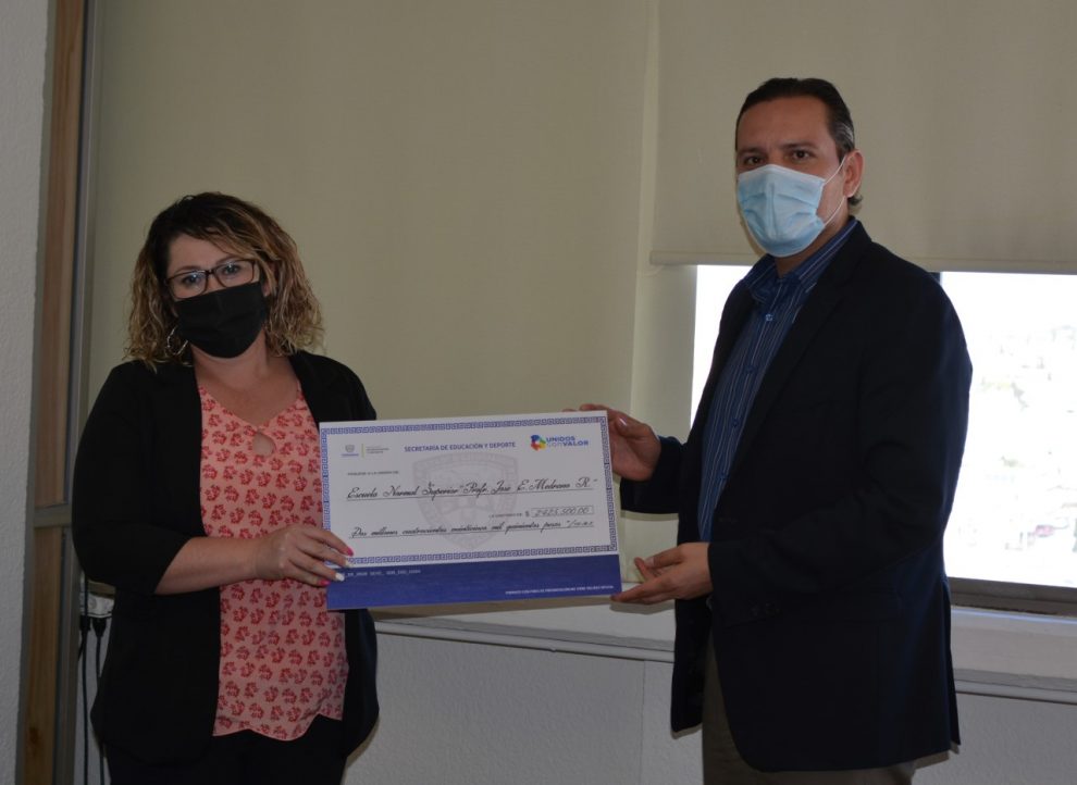El director administrativo de la SEyD, Héctor Iván Ortega Baca, hizo entrega de los cheques a las y los titulares de las instituciones formadoras de docentes beneficiadas.
