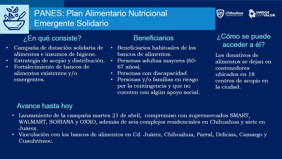 Dijo que se trata de garantizar el derecho a la alimentación a los chihuahuenses que se vean afectados por esta situación. Ante la pandemia, las solicitudes se incrementaron de 142 a de 2 mil 798 en abril y se atenderá a todos los que necesiten.