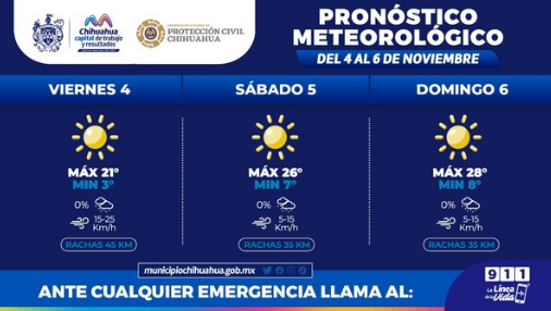 Para el sábado se espera una máxima de 26°C y mínima de 7°C; mientras que, para el domingo se prevé una máxima de 28°C y mínima de 8°C con vientos de hasta 35 kilómetros por hora.
