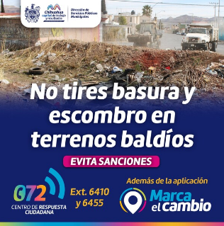 Chihuahua, Chih. A 18 de abril de 2023.- Con el objetivo de mantener una buena imagen urbana, el Gobierno Municipal que encabeza el alcalde Marco Bonilla, a través de la Dirección de Servicios Públicos Municipales, invita a la población a evitar tirar basura o escombro en viviendas abandonadas y terrenos baldíos de la ciudad.