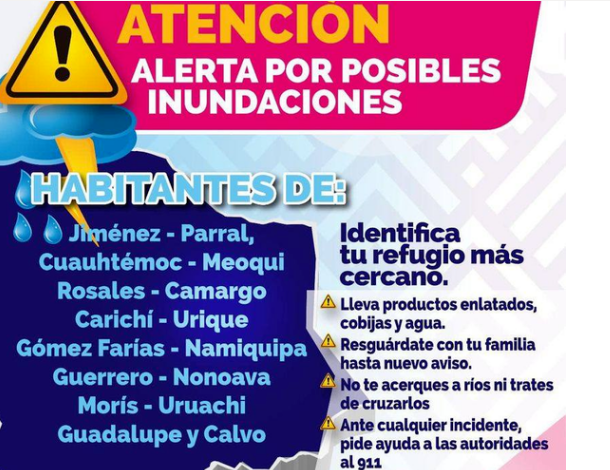 También se esperan lluvias de dispersas a moderadas con chubascos de 5.1 a 25 mm en Morelos, Balleza, Guachochi, Rosario, Huejotitan, San Francisco del Oro, El Tule, Santa Bárbara, Parral, Allende, Jiménez, López, Coronado, Valle de Zaragoza y Camargo.