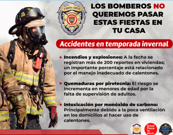 El Gobierno Municipal a través del Heroico Cuerpo de Bomberos, exhorta a los chihuahuenses a seguir recomendaciones preventivas para evitar accidentes derivados del uso de calefactores a gas, que producen monóxido de carbono, son susceptibles a fugas y podrían generar incendios o intoxicaciones dentro de los hogares o establecimientos.