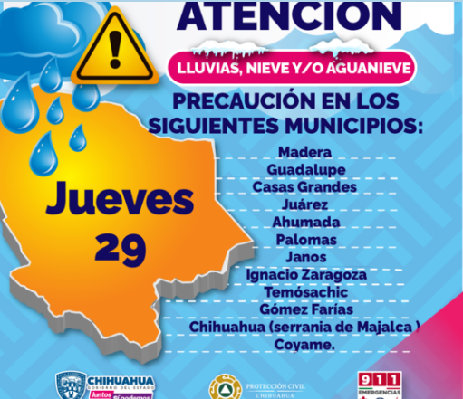 Además persistirá el pronóstico de lluvias nieve y aguanieve en Juárez Guadalupe, Ascensión, Janos, Nuevo Casas Grandes, Buenaventura, Namiquipa, Ocampo, Guerrero, Bocoyna, Chínipas, Cuauhtémoc, Chihuahua, Delicias, Camargo, Parral y Manuel Benavides.