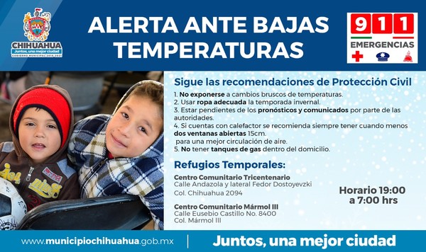 El Gobierno Municipal a través de la Coordinación de Protección Civil, exhorta a la ciudadanía a tomar las previsiones necesarias ante el descenso en las temperaturas que se proyectan para este domingo 25 y lunes 26 de noviembre, a fin de evitar afecciones respiratorias o incidentes relacionados con las condiciones climáticas.