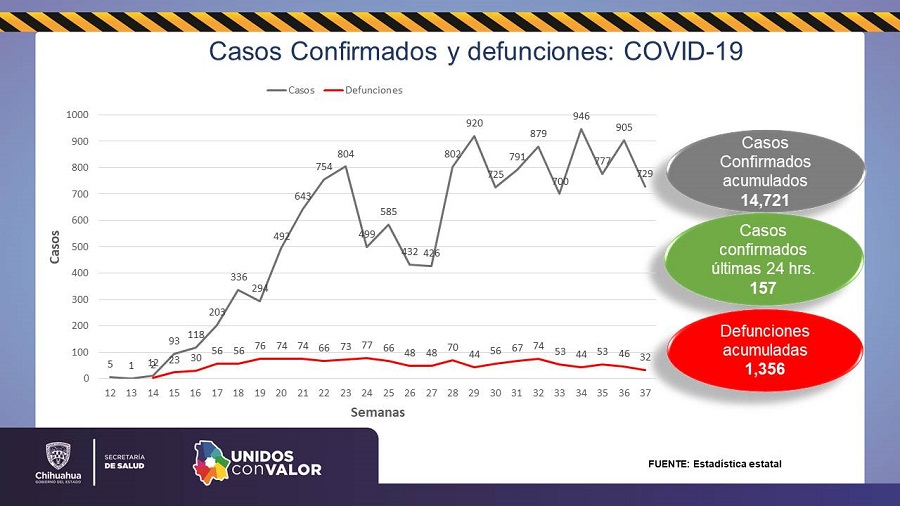 El estado de Chihuahua tiene un total general de 14 mil 721 casos confirmados de COVID-19 con 157 nuevos, mientras que los decesos aumentaron a mil 356 con otras 10 personas fallecidas: 4 en Chihuahua, 3 en Cuauhtémoc, 2 en Guerrero y 1 en Madera.