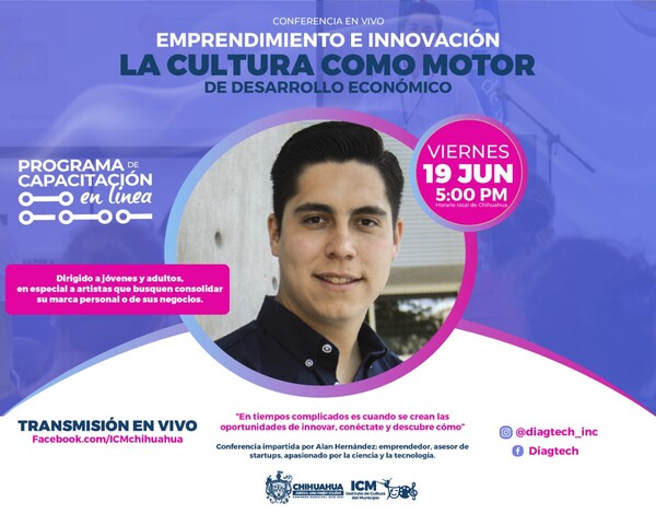 Con el fin de impulsar el emprendedurismo desde la trinchera del arte y la cultura el Gobierno Municipal a través del Instituto de Cultura (ICM), realizará la conferencia “Emprendimiento e Innovación: La cultura como motor de desarrollo económico”, e invita a todos los interesados en participar a no perderse la transmisión en vivo este viernes 19 de junio en punto de las 5:00 pm horario de la ciudad de Chihuahua, en las redes del ICM.