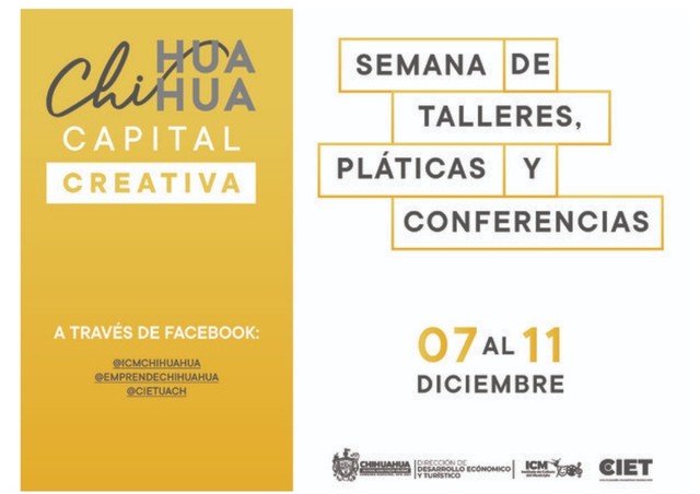 El Gobierno Municipal de Chihuahua invita a la comunidad a no perderse la semana “Chihuahua Capital Creativa”, evento organizado por el Instituto de Cultura del Municipio (ICM) y la Dirección de Desarrollo Económico y Turístico, en colaboración con el Centro de Innovación y Emprendimiento Tecnológico de la Universidad Autónoma de Chihuahua, que se llevará a cabo del 7 al 11 de diciembre a través del Facebook.com/ICMchihuahua.