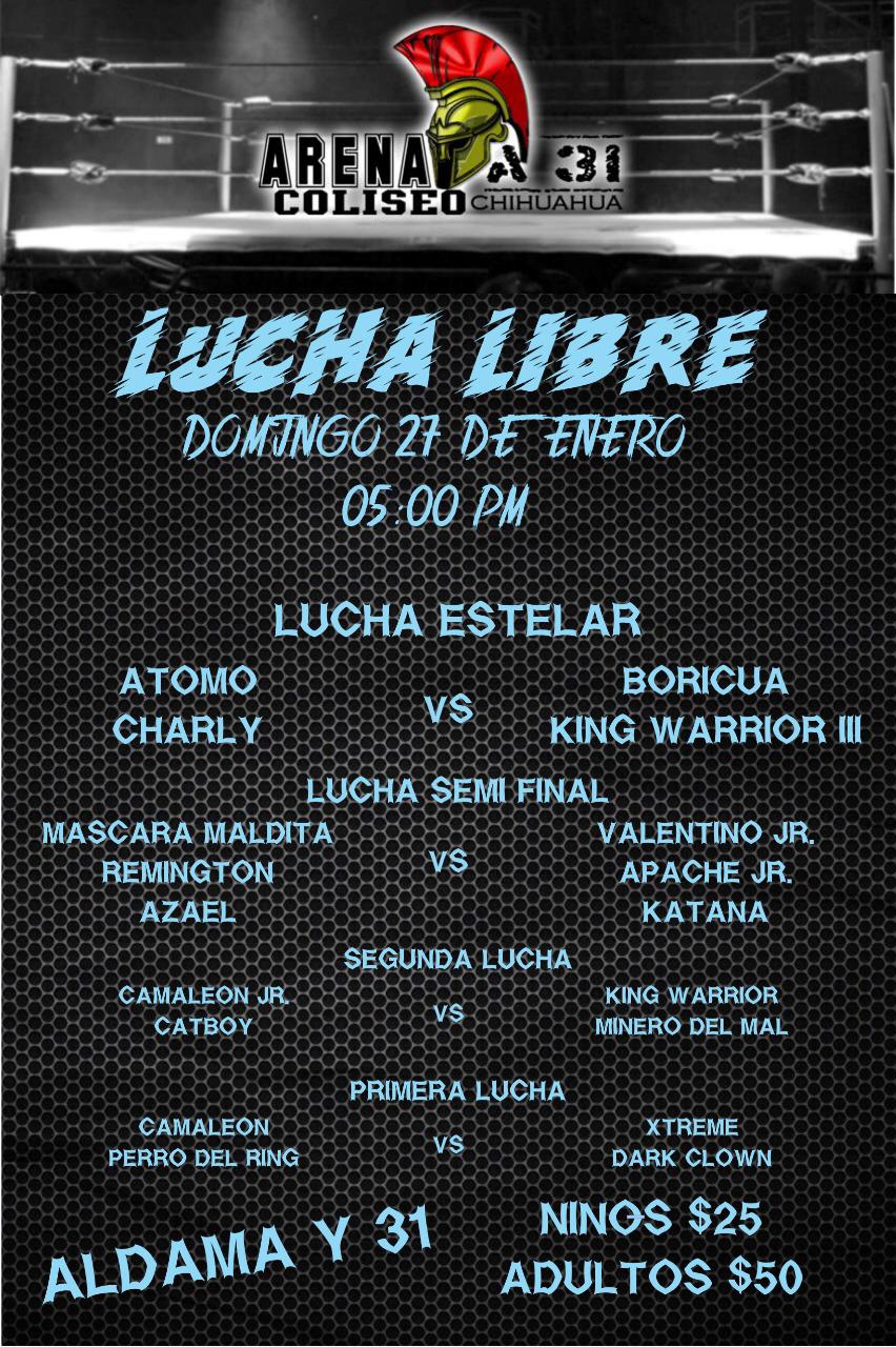 Valentino Jr., Apache Jr., y Katana; y la lucha estelar estará a cargo de Átomo y Charly VS. Boricua y King Warrior III.