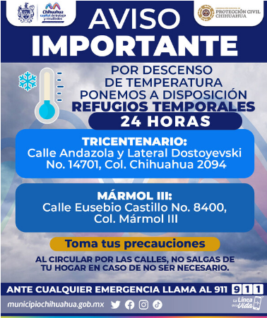 Se invita a la ciudadanía a canalizar a personas en situación de calle, para que reciban una atención adecuada en los refugios temporales. Así como también, mantenernos atentos a los posibles cambios climatológicos por medio de los canales oficiales y redes sociales de las autoridades municipales y estatales de Chihuahua.