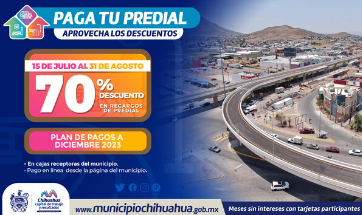 Chihuahua, Chih. A 14 de julio de 2023.- El Gobierno Municipal, a través de la Tesorería, invita a aprovechar el descuento del 70 por ciento en los recargos del Impuesto Predial, que estará vigente del 15 de julio al 31 de agosto.