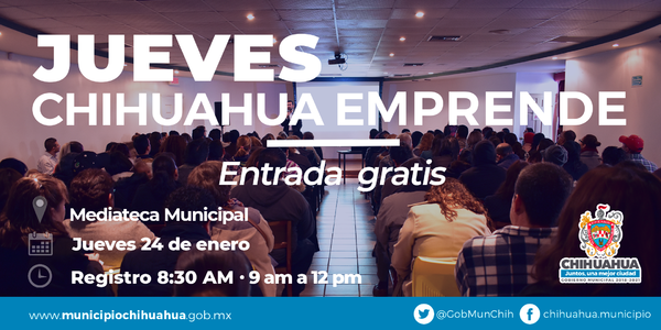 El Gobierno Municipal, a través de la Dirección de Desarrollo Económico y Turístico invita a los interesados en abrir su propio negocio a asistir al Taller Jueves Chihuahua Emprende, el cual se llevará a cabo el próximo 24 de enero en la Mediateca Municipal. Lo anterior tras el éxito de la primera edición anual de este taller, realizada el pasado 17 de enero.