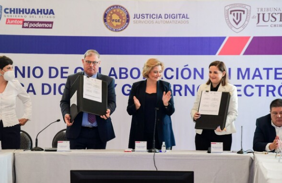 La gobernadora del Estado de Chihuahua, Maru Campos Galván encabezó la firma de convenio entre el Gobierno del Estado y el Poder Judicial para el lanzamiento de la Plataforma “Justicia Digital: Servicios Automatizados de la Fiscalía General del Estado”, la cual permitirá la utilización conjunta de sistemas, equipos, interfaz tecnológica y