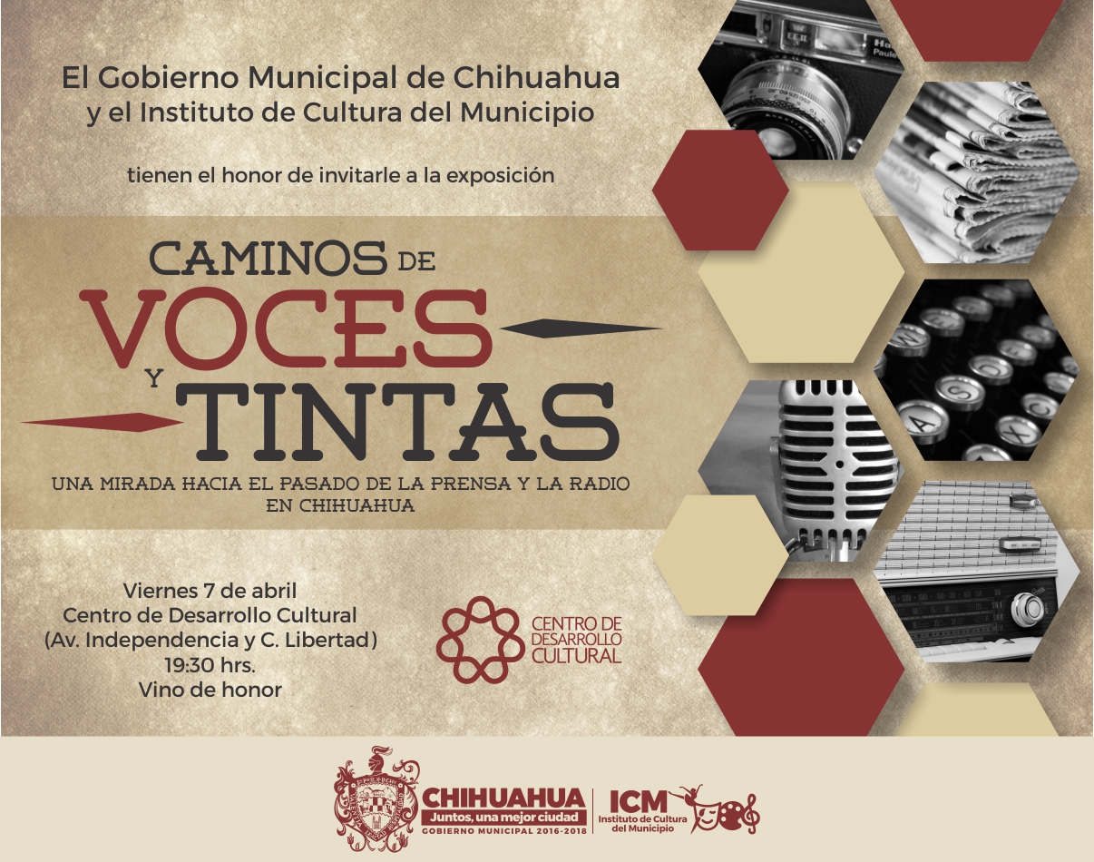 El Gobierno Municipal, a través del Instituto de Cultura del Municipio, invita a la inauguración de la exposición “Caminos de Voces y Tintas”, una mirada al pasado de la prensa y la radio en Chihuahua, que se realizará este viernes 7 de abril, a las 19:30 horas en el Centro de Desarrollo Cultural, ubicado en la Presidencia Municipal, en la esquina de las calles Independencia y Libertad, en el Centro Histórico de la ciudad.