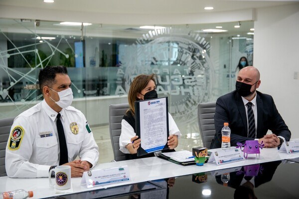 La alcaldesa María Angélica Granados, encabezó la firma de esta alianza celebrada vía zoom con Kristian Hölge, representante de la Oficina de UNODC, donde estuvo acompañada por el comisario Gilberto Loya Chávez titular de la Dirección de Seguridad Pública Municipal y Simeón Esparza Peynado, subdirector de Formación de la Escuela de Policía.