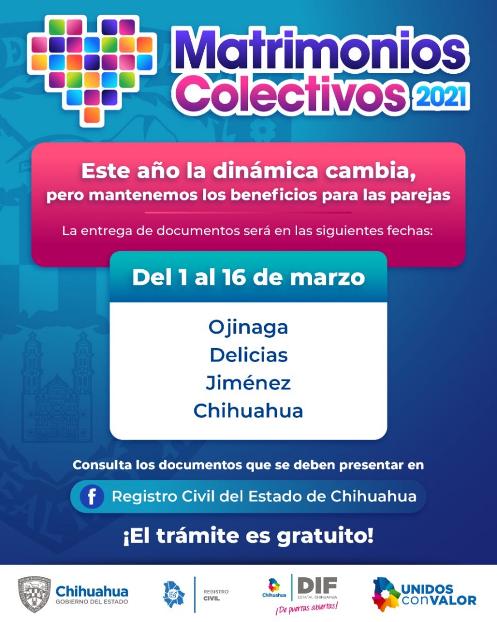 El Registro Civil del Estado informa que el próximo lunes 1 de marzo arranca la segunda etapa de los Matrimonios Colectivos 2021, por lo que se estará recibiendo documentación de las parejas interesadas en formalizar su relación en las oficinas de Ojinaga, Delicias, Jiménez y Chihuahua.