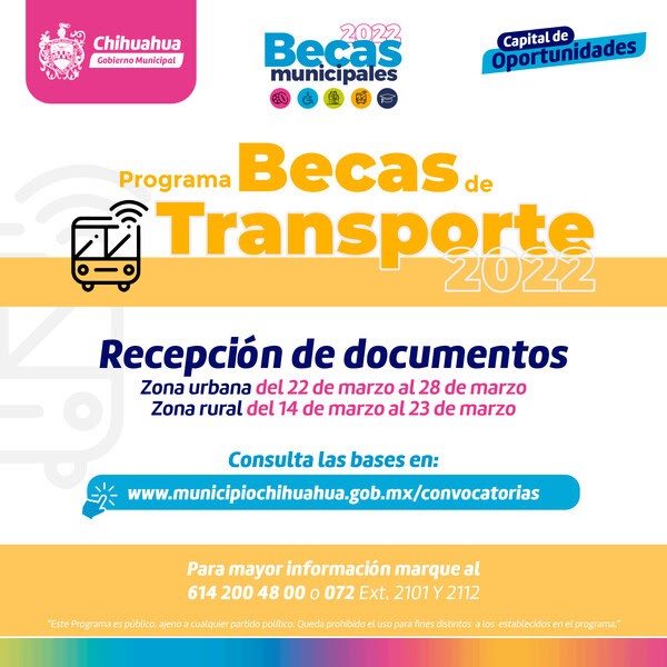El Gobierno Municipal, a través de la Dirección de Desarrollo Humano y Educación, iniciará este martes 22 de marzo la recepción de solicitudes y documentos de los estudiantes de la ciudad que deseen obtener el beneficio económico de las Becas de Transporte.