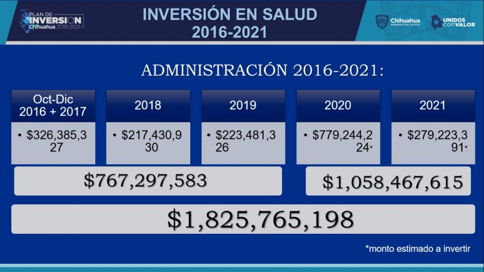 El gobernador Javier Corral informó que la inversión realizada y presupuestada para el periodo 2016-2021, alcanza 1 mil 825 millones 765 mil 198 pesos para la construcción, ampliación y equipamiento de unidades médicas, una acción sin precedente en la historia de Chihuahua.