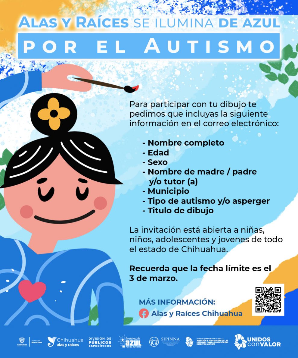 Con la finalidad de dar voz sobre la diversidad de visiones de niñas, niños y jóvenes que habitan en Chihuahua, la Secretaría de Cultura, a través del Programa Alas y Raíces, en conjunto con la Asociación Iluminemos de Azul, realiza el concurso de dibujo dirigido a niños, niñas y jóvenes con Autismo o Síndrome de Asperger.
