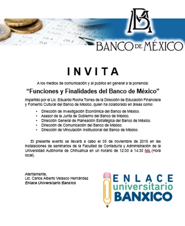 El Centro Universitario Parral, a través del Programa Enlaces Universitarios del Banco de México y BANXICO, invita al público en general a la ponencia “Funciones y Finalidades del Banco de México” a llevarse a cabo este próximo 5 de noviembre en las instalaciones de Seminarios de la Facultad de Contaduría y Administración de la Universidad Autónoma de Chihuahua.