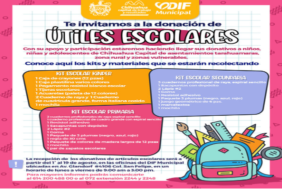 Con la finalidad de brindar apoyo a las niñas, niños y adolescentes de asentamientos rarámuris, zonas rurales y zonas vulnerables de la ciudad, el Gobierno Municipal a través del DIF invita a la ciudadanía en general a realizar un donativo de útiles escolares nuevos, que ayuden a aprovechar al máximo las clases este próximo ciclo escolar 2022-2023.