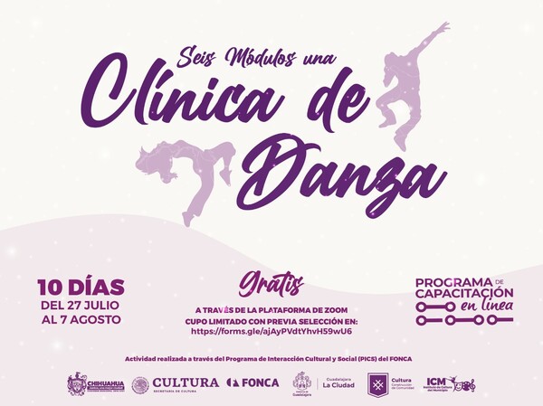 Con el fin de seguir impulsando e incentivando los talleres desde casa, el Gobierno Municipal a través del Instituto de Cultura del Municipio de Chihuahua en colaboración con el Fondo Nacional para la Cultura y las Artes (FONCA) invita a bailarines, artistas y/o conocedores de la danza que busquen perfeccionar su técnica, a participar en la “Clínica de Danza” que se llevará a cabo del 27 de julio al 7 de agosto a través de la plataforma zoom totalmente gratis.