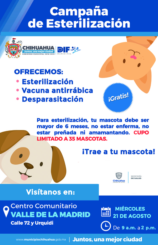 El DIF invita a la ciudadanía a participar en la próxima fecha de esterilización, las cuales se realizaran en los centros comunitarios de Chihuahua, el 4 de septiembre en la colonia Aires del Sur, en la calle Fernando Orozco y calle 102 en un horario de 9 a 1 de la tarde.