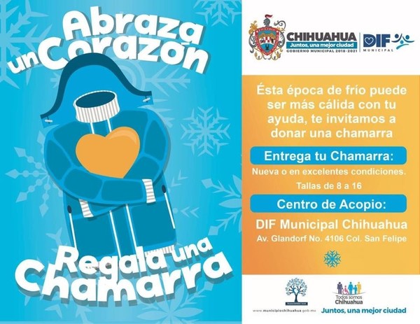 El Gobierno Municipal a través del DIF invita a la comunidad chihuahuense a sumarse a la campaña, “Abraza un corazón, regala una chamarra”, con la cual se busca de dotar de prendas que abriguen a las niñas, niños y adolescentes que menos tienen y más lo necesitan durante esta temporada invernal.