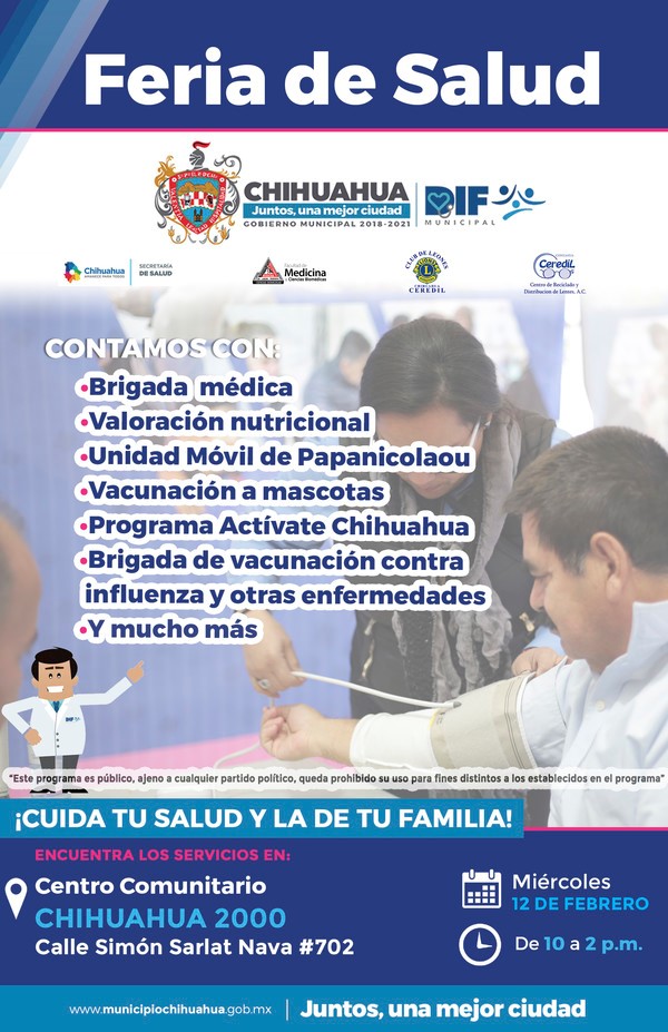 Con la finalidad de acercar servicios de salud que beneficien y fortalezcan la salud de las familias chihuahuenses, brindándoles las herramientas para la prevención de enfermedades y para tener una mejor calidad de vida, el Gobierno Municipal a través del DIF, invita a la ciudadanía participar en la Feria de Salud a realizarse el próximo miércoles 12 de febrero en el centro comunitario Chihuahua 2000.