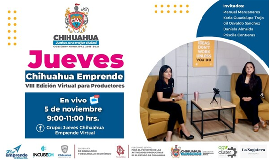 Si eres productor, o tienes una idea de negocio del sector agrario, el Gobierno Municipal de Chihuahua te invita a la octava edición del Jueves Chihuahua Emprende Virtual, que se llevará a cabo este jueves 5 de noviembre a través de Facebook. El evento iniciará a las 9:00 de la mañana y se transmite en vivo.