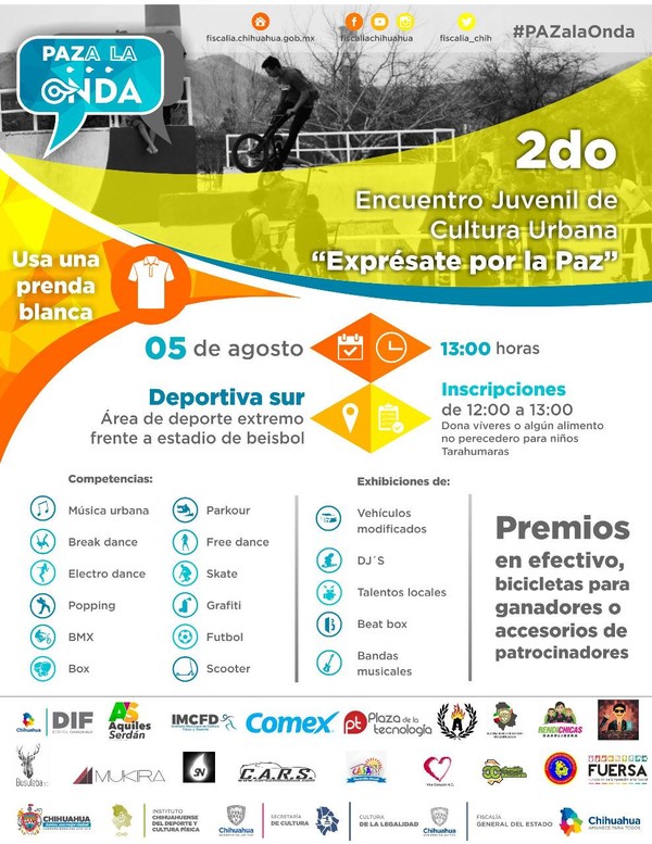 Con la finalidad de promover en los jóvenes chihuahuenses actividades sanas y deportivas alejándolos de situaciones ilícitas, el Gobierno Municipal convoca a participar en el Segundo Encuentro Juvenil de Cultura Urbana, “Exprésate por la Paz” que desarrollará a través de la Dirección de Desarrollo Humano y en coordinación con la Fiscalía General del Estado.