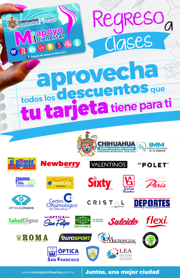 A fin de contribuir a la economía de las familias chihuahuenses, el Gobierno Municipal, a través del Instituto Municipal de las Mujeres (IMM) invita a la ciudadanía a aprovechar los descuentos que la tarjeta Mi apoyo, Mi bienestar ofrece.