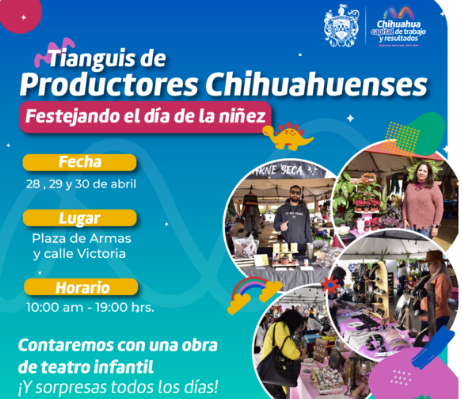 El Gobierno Municipal de Chihuahua, encabezado por el alcalde Marco Bonilla, invita al Tianguis de Productores Chihuahuenses, en conmemoración del Día de la Niñez, el cual se llevará a cabo del 28 al 30 de abril desde las 10:00 am hasta las 8:00 pm, en el primer cuadro de la ciudad.