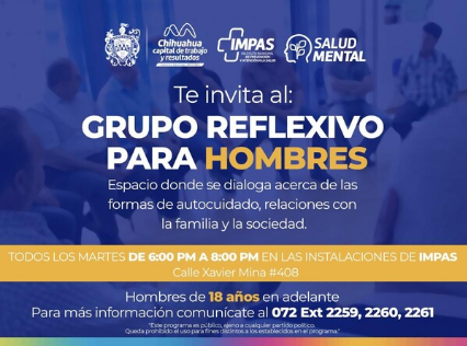 Chihuahua, Chih., A 16 de marzo de 2023.- Al ser la salud mental un tema de especial interés para el alcalde Marco Bonilla, el Gobierno Municipal de Chihuahua, a través del Instituto Municipal de Prevención y Atención a la Salud (IMPAS), invita a los chihuahuenses a formar parte del grupo reflexivo para hombres.