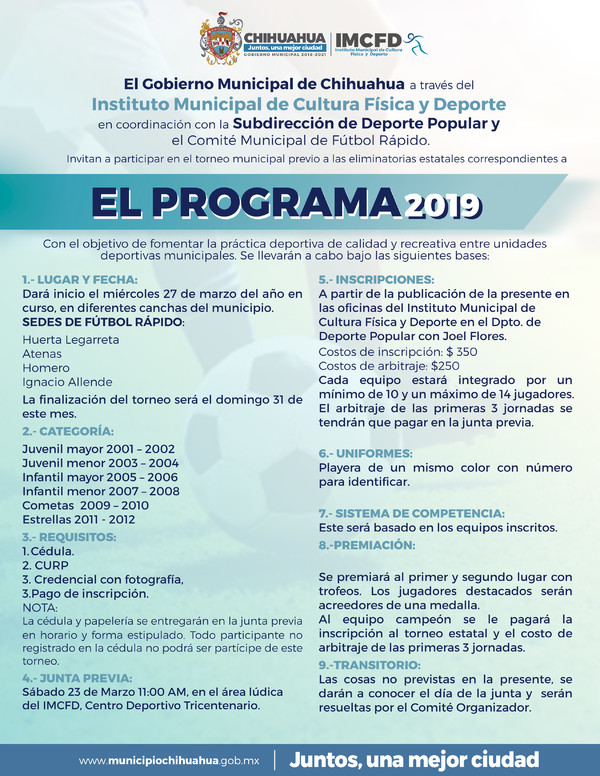 El Gobierno Municipal de Chihuahua a través del Instituto Municipal de Cultura Física y Deporte dio a conocer las convocatorias para el registro de equipos juveniles e infantiles de futbol, con el objetivo de ser partícipes de los torneos en puerta.