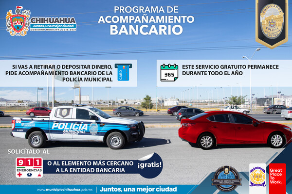 Con el objetivo de cuidar el patrimonio de los ciudadanos, el Municipio de Chihuahua, a través de la Dirección de Seguridad Pública, continúa ofreciendo el programa de “Acompañamiento Bancario”, a fin de ofrecer escolta policial y garantizar un trayecto seguro a quienes manejan efectivo, sobre todo en estos momentos en que la economía ha sufrido afectaciones derivadas de la pandemia por COVID-19, para lo cual deben realizar una llamada al 9-1-1 y solicitar el apoyo.